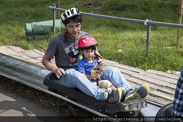 小朋友可以和大人合坐一台(我忘了幾歲後才能自己坐),雖然只是坐在板子上,但還是可以藉由拉桿控制剎車和前進,不過大約只有下坡時比較有作用。