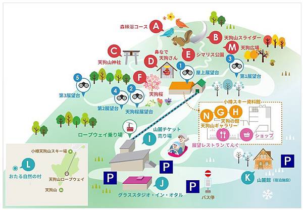 除了幾個展望台之外,主要是天狗山神社附近的散步道,還有夏天才開放的花栗鼠公園及溜滑梯。